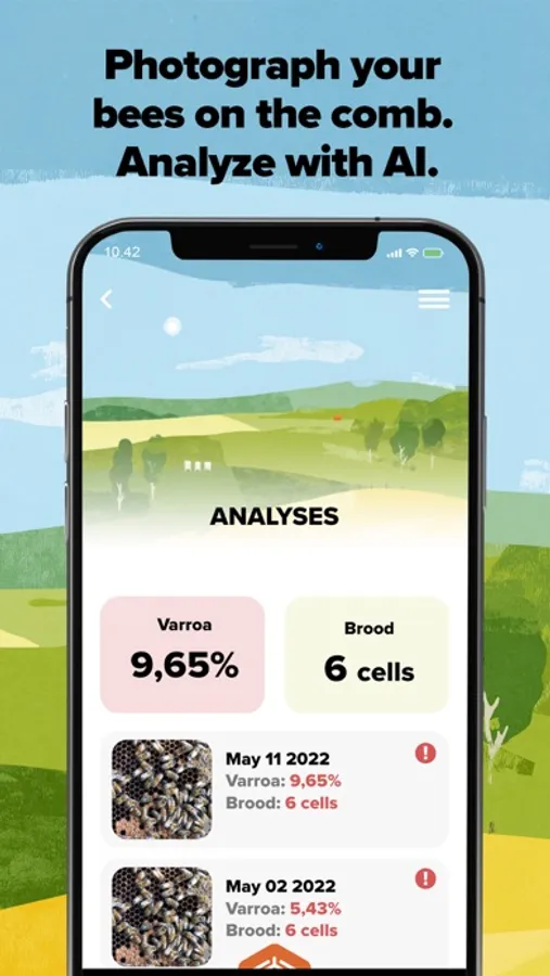 BeeScanning is the fast, reliable and bee-friendly way to analyze the health of your bees. Find and count varroa mites and sick brood instantly with your camera. The BeeScanning AI* analyzes your bee images in seconds and warns you of potential threats in your bee colonies. Now including bee management functionality for healthier hives.