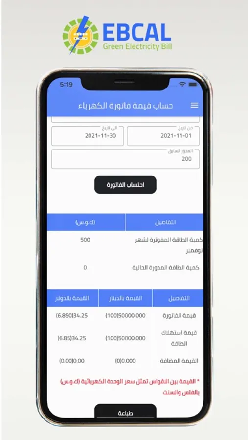 كذلك يحسب التطبيق عامل مهم جدا وهو معدل سعر التعرفة الكهربائية (اي سعر كيلو واط ساعة (ك.و.س))، والناتجة عن قسمة القيمة المحتسبة على كمية الطاقة المفوترة. وتحتسب كافة العوامل المشار اليها اعلاه بالعملة الوطنية وكذلك بالدولار الامريكي حسب سعر الصرف العالمي الحالي للعملة الوطنية.