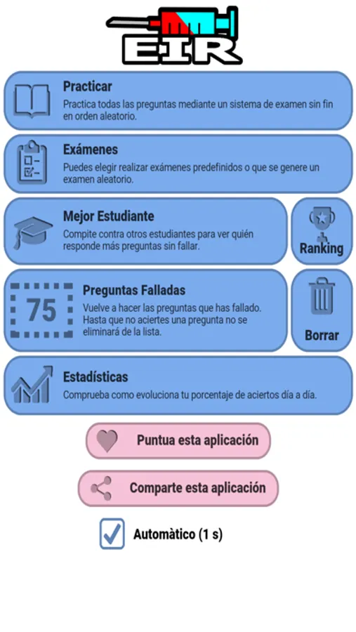 - Estadísticas para consulta la evolución de tu tasa de aciertos.