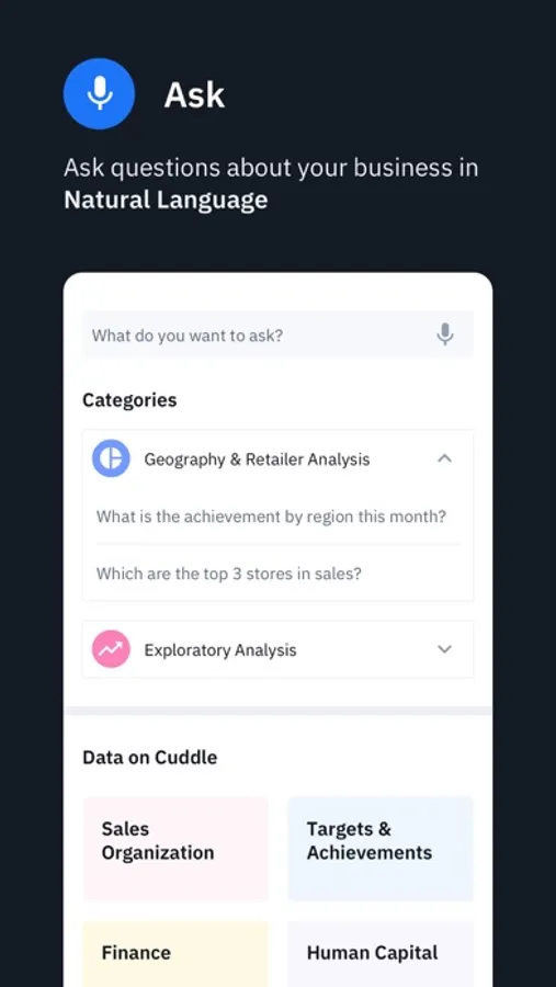 Ask questions about your business in Natural Language and get instant answers through interactive visuals.