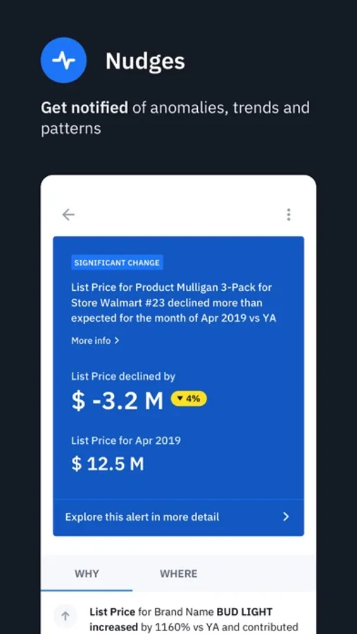 Get automated notifications of any anomalies, trends or patterns on areas of business you care about.
