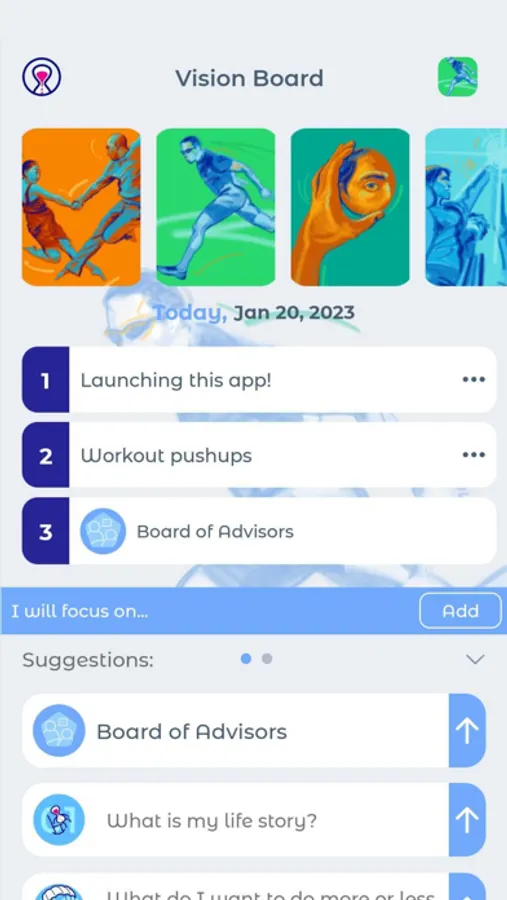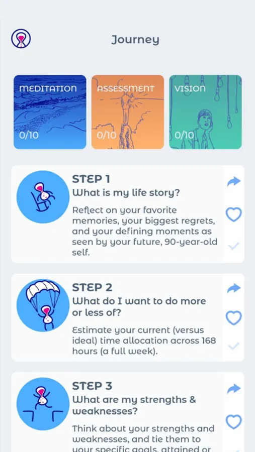 Users unlock special Tools to help with meditation, goal tracking and time management as they complete Steps in the Journey tab. Daily & Weekly Check-Ins facilitate self-awareness, and optimize Energy levels throughout the week. Manage Vision Boards that can act as Intentions, reminders or motivational notes for different periods of time - Day, Week or Month. Share your Goals with others, including Advisors. Connect socially with others to see what Goals they're working on and support them with comments, cheers and advice.