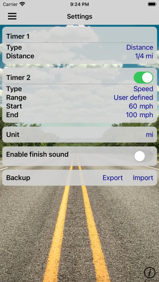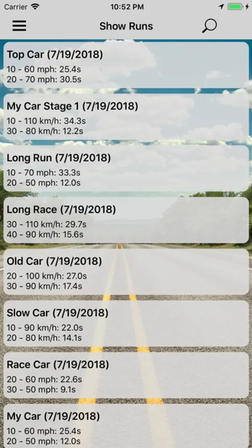The app supports drag races such as 1/4 mile races or speed-based races such as 100 - 200 km/h and can measure up to two times per race.