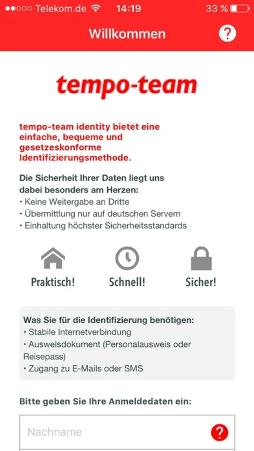 With identity video identification for tempo-team you will be identified safely and quickly from anywhere. To complete this procedure, you will only need a valid ID document, a stable internet connection and access to your E-Mails or SMS. The identification process is carried out within a video chat session and takes only a few minutes.