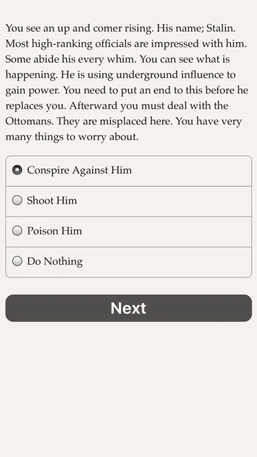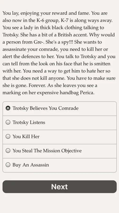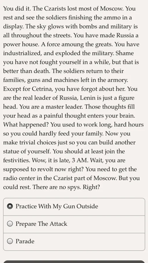 "Comrade or Czar" is a 60,000 word interactive novel by Albnoob, where your choices control the story. It's entirely text-based—without graphics or sound effects—and fueled by the vast, unstoppable power of your imagination.
