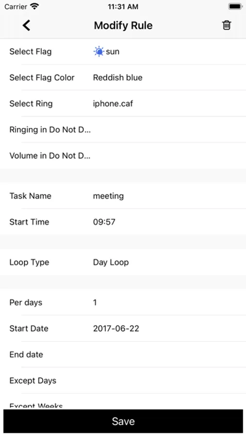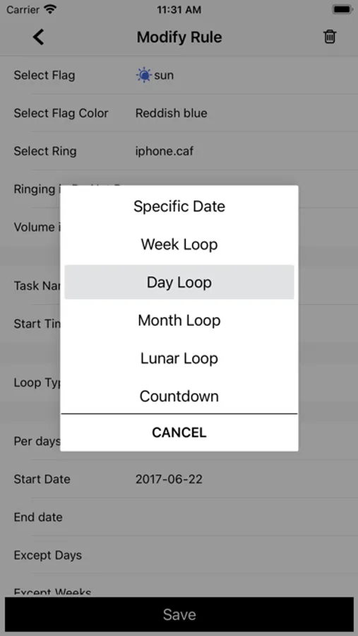 8. default configuration, configurable default tone, random icon, automatically generates the task (according to the rational allocation of mobile phone performance is automatically generated reminder list), the default rule generation name, remind Limited (according to the rational allocation of mobile phone performance generation period, the longer the impact speed).