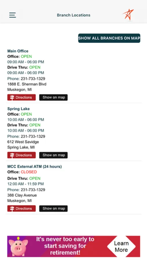 With a single tap, you can find the fee-free ATMs and Shared Branch locations near you. Our search feature provides addresses and branch contact information.