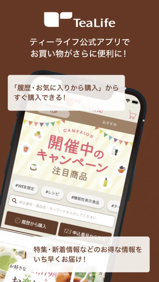 健康・ダイエット・スキンケアの通信販売「ティーライフ」の公式アプリでは、アプリ限定のコンテンツやお得な情報をいち早くお届けします!