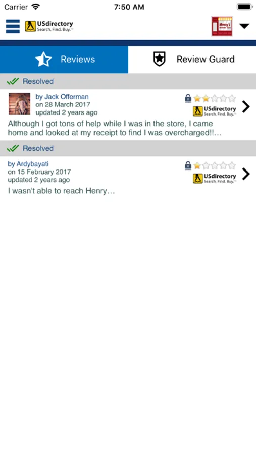 Participating USdirectory Merchants can use this app to check reviews about their business from over 2000 digital review sources. Get notified instantly when someone posts a sub-par review on USdirectory and then use USdirectory's instant customer chat screen to resolve your unhappy customer's concern thereby increasing your chance of getting only positive reviews.