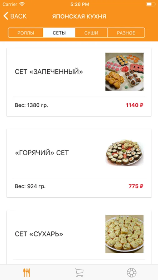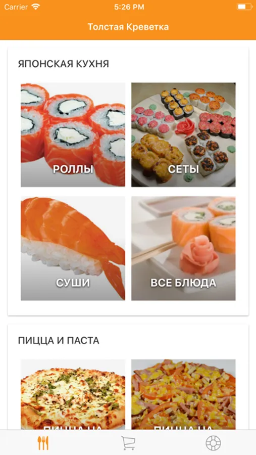 Ассортимент "Толстой Креветки" включает в себя японскую, итальянскую, европейскую, узбекскую кухни, а так же шашлык, фастфуд и десерты.