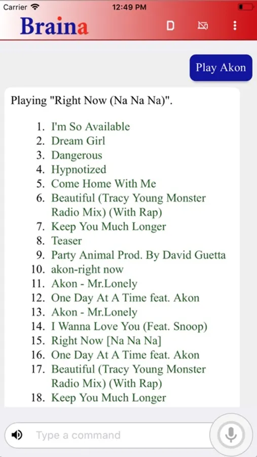 • Play Songs - No need to search songs on your computer. For example just say, Play Hips Don't Lie or Play Akon and Braina will play it for you from anywhere in your computer or even the web.