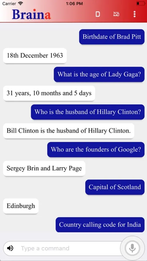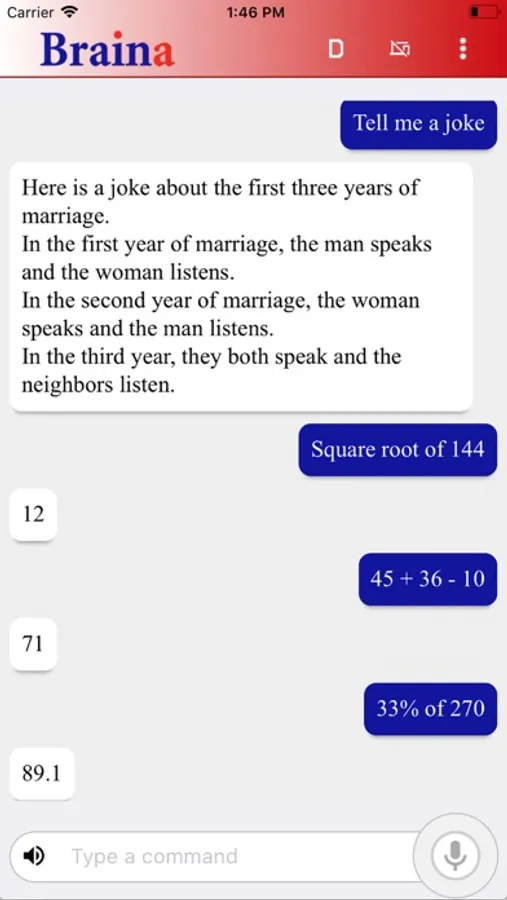• Calculator - Do calculations by speaking. - e.g 45 plus 20 minus 10 . Braina can even help you in mathematics.