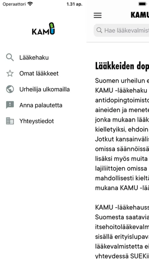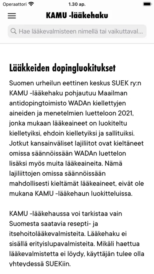 In Finland and other countries, medication may be available with the same name but containing different pharmacological substances. For this reason, the permissibility of any medicine obtained abroad must not be checked in the KAMU medicine search. Technochemical products, homeopathic preparations, nutritional supplements and natural health products are excluded. The composition of such products must be ascertained from the vendor or importer. Request a certificate verifying that the products do not contain any substances that will cause an adverse analytical finding. In some cases, nutritional supplements may contain prohibited substances even if they are not mentioned in the list of ingredients.