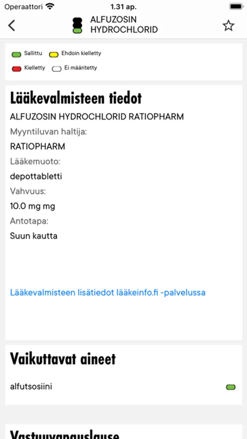 When checking the product, check that the route of administration corresponds with the searched product. The medicine search includes products of the same name with different routes of administration, e.g. tablet or cream. One of these may be allowed and the other prohibited. Medication may contain several active ingredients that have different doping classifications. If the medication contains even one prohibited active ingredient, the medication is prohibited. The footnotes contain detailed information.
