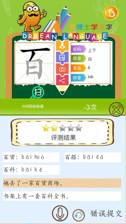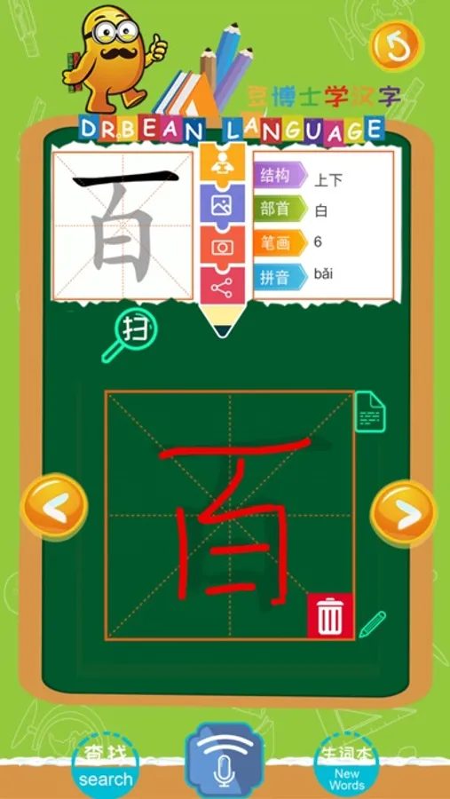 豆博士学汉字是一款有效帮助汉语初学者正确书写汉字,找到语感的学习应用软件,软件同时具备听说读写四大功能。写字有铅笔效果和毛笔效果二种功能,每个汉字都标注拼音,笔划,部首,图片,组词和造句。通过我们的语音评测功能可以更加有效地练习发音,解决初学者在学习汉语时的痛点和烦恼,也可以更加有效提高记忆力和趣味性。