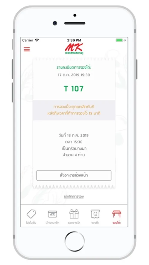 ระบบสั่งอาหารล่วงหน้า (Pre-ordering) : สำหรับลูกค้าที่จองคิวหรือสำรองโต๊ะล่วงหน้ามาก่อนแล้วเท่านั้น สามารถสั่งอาหารผ่านแอปพลิเคชั่นได้เลย และแสดง QR Code ให้กับพนักงานที่สาขา