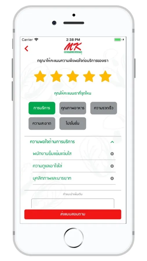 ระบบการประเมินความพึงพอใจ (Customer Satisfaction Survey) : ตอบรับทุกความคิดเห็นของคุณที่ได้รับจากประสบการณ์ในแต่ละมื้อสุกี้ด้วยวิธีการง่ายๆ ผ่านแอปพลิเคชั่น myMK