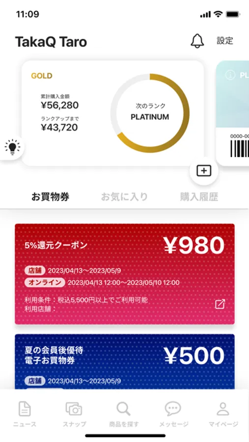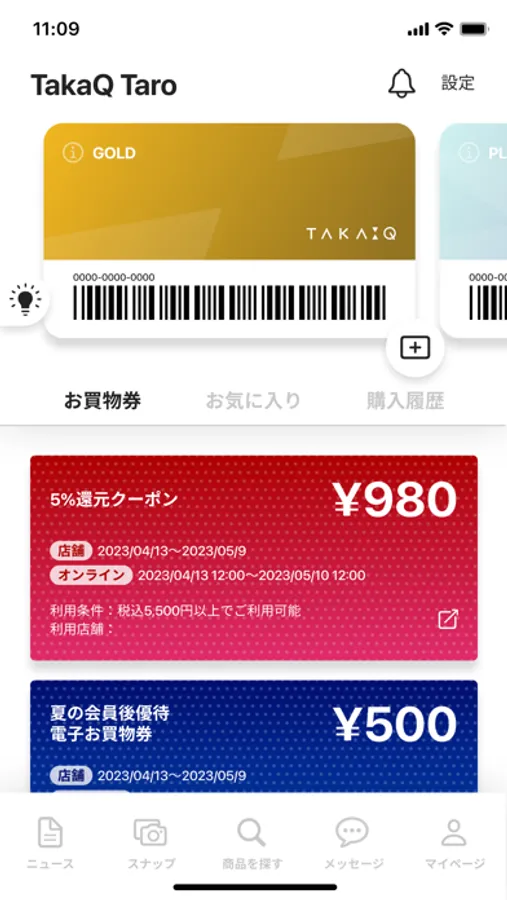 お手元のタカキュー会員カードをアプリに取り込むことができます。取り込んだ会員カードはいままで通り店舗でご利用いただけます。複数枚のカードがアプリ内にまとまってコンパクトになります。