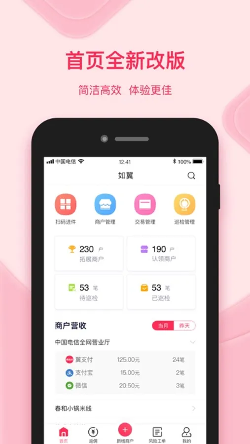 如翼是给翼支付代理商提供一个拓展与管理统计商户的app,代理商通过app对拓展商户进行进件,审核成功的商户可以通过商户版“钱到啦”app进行收款,代理商通过“如翼”app查看数据与管理。此app不对外开放,没有注册功能,只提供给我们线下推广与合作的代理商使用。