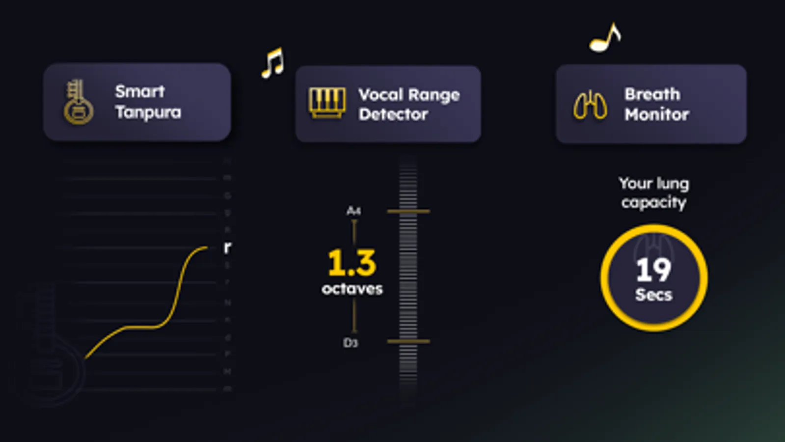 The smart visual tanpura in Riyaz helps you know and fix your mistakes before anyone else can. Let Riyaz record your practices and know how much you exercised your voice!