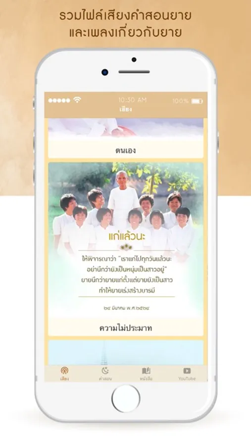ทันทีที่โหลดแอพนี้ ท่านจะได้ฟังเสียงคำสอนคุณยายที่รวบรวมมาจัดเป็นหมวดหมู่ และสามารถอ่านคำสอนที่ระบบจะสุ่มออกมาให้ท่านได้ทันที โดยที่ไม่ต้องต่ออินเตอร์เน็ต !