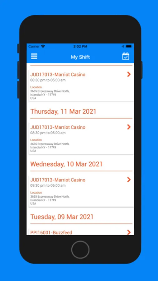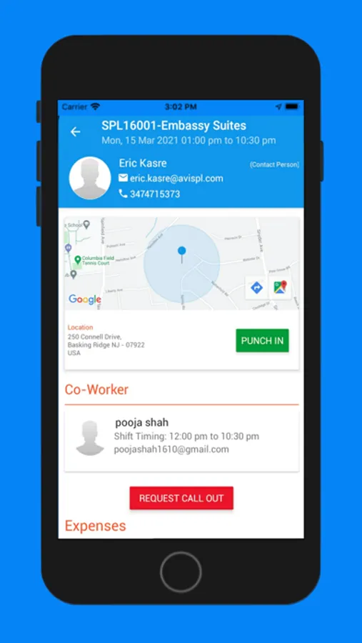 Here technician can see the previous, current and future shifts/projects assigned to him. Also, he can see projects details, like work location, shift timing, co-workers, also session and payroll of previous projects. In details, it shows the contact person, email id and contact for each particular project. If technician clicks on the map then it will redirect them to google map. He can apply the filter to see projects of any particular dates assigned to them.