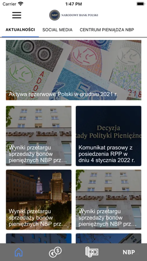 Moje NBP to aplikacja mobilna Narodowego Banku Polskiego. Znajdą w niej Państwo informacje o banku centralnym Polski oraz aktualności m.in. z mediów społecznościowych NBP, a także dotyczące polityki pieniężnej i wydarzeń organizowanych przez NBP i Centrum Pieniądza NBP.