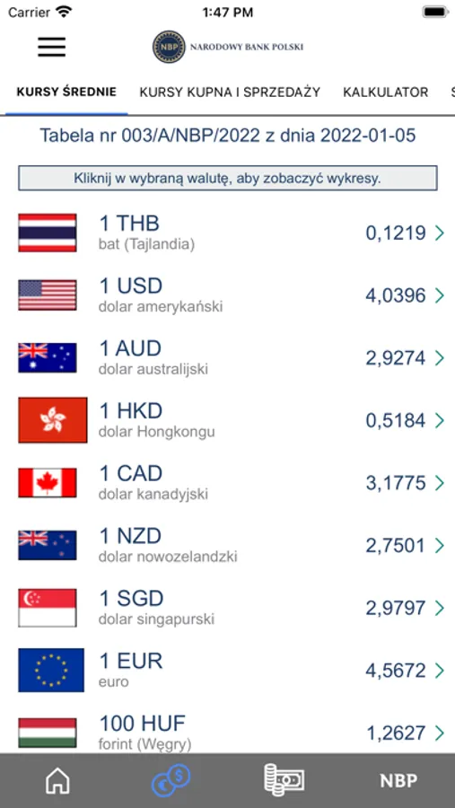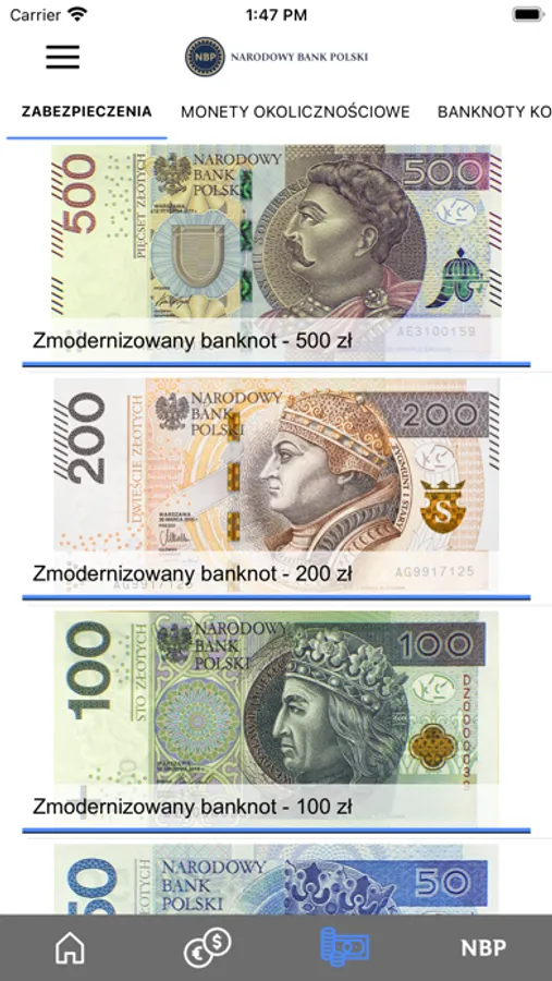 W aplikacji Moje NBP można śledzić aktualne i historyczne kursy walut oraz skorzystać z kalkulatora walutowego, znaleźć bieżące informacje o emisji banknotów i monet kolekcjonerskich. Polecamy również sekcję poświęconą polskim banknotom i monetom obiegowym.