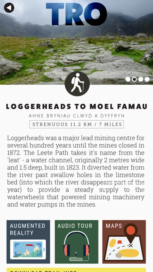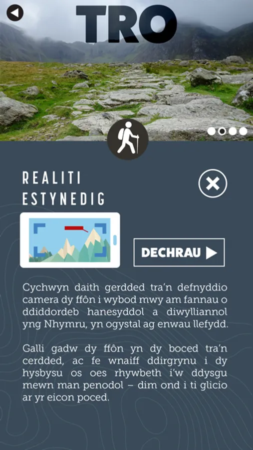 Ap i’ch tywys ar droed ydi Tro. Dewch i agor drws ein henwau lleoedd yn ardal ogleddol Llwybr Cenedlaethol Clawdd Offa a chael eich arwain at gyfoeth ein treftadaeth. Dewch ar antur ar hyd llwybrau realiti estynedig eich ffôn a darganfod mwy am gyfoeth yr iaith a hanes Cymru o fewn yr ardal arbennig hon o harddwch naturiol eithriadol.