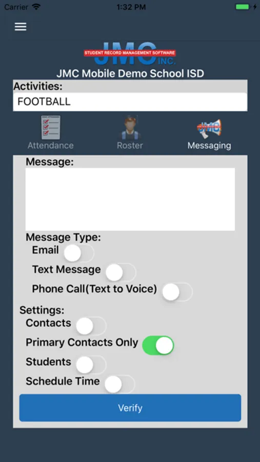 Always stay connected to your students and parents through JMC's Coach and Activity App. Whether you are on the basketball court, running the sidelines or with the marching band on the bus you can send messages to parents, look up contact information, set your rosters and much more.