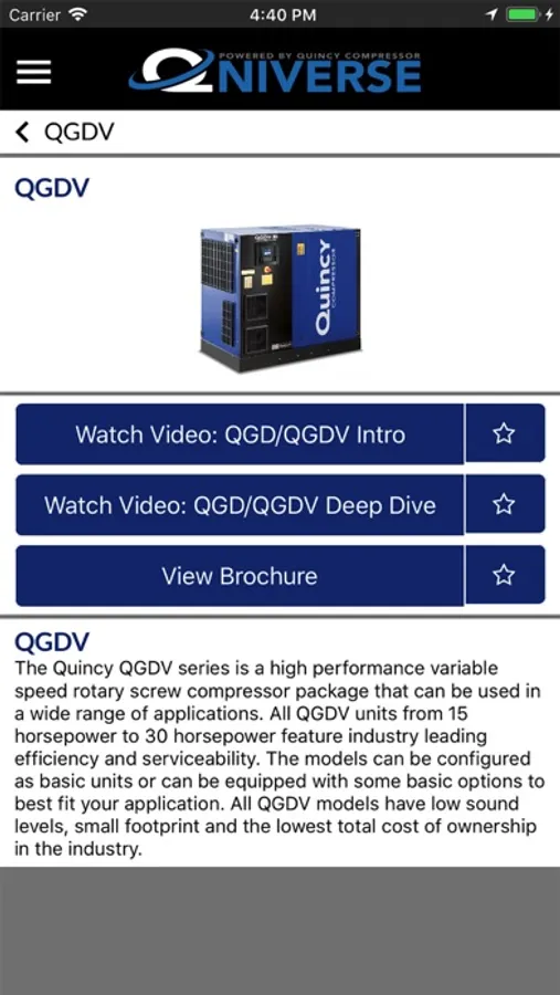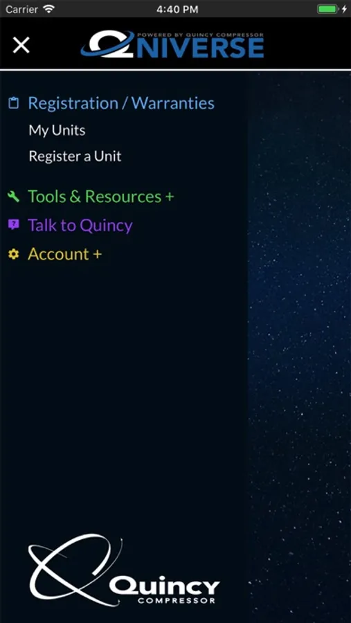 The Qniverse app makes it easy to register your warranty, look up your unit's part book and manual, find your nearest dealer, browse the Quincy Compressor product catalog, view product videos, and more.