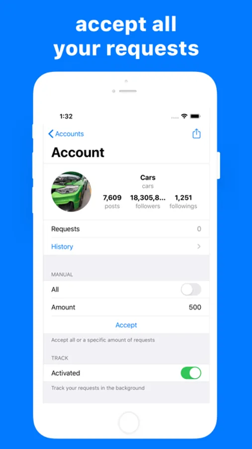 This App offers an easy and intuitive experience. Just sign-in your Instagram accounts and start accepting your pending requests.