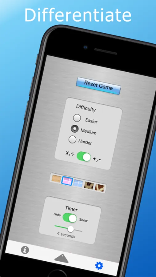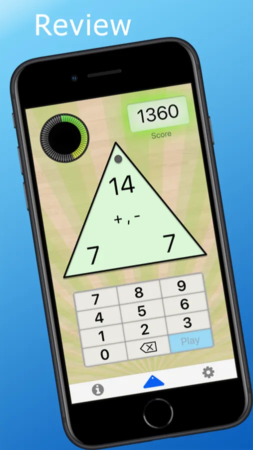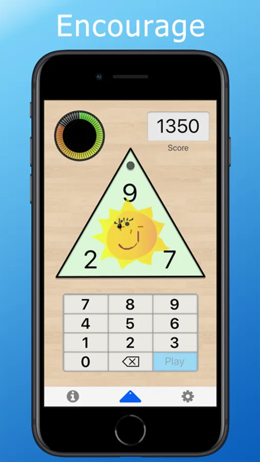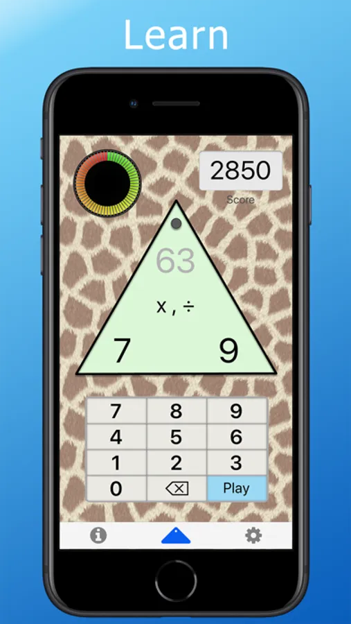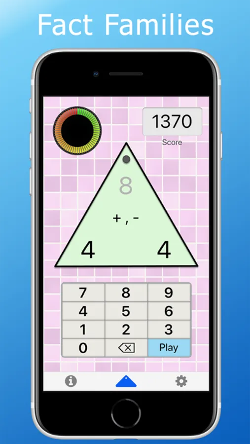A math facts drill-and-practice program that teaches fact families for both addition/subtraction and multiplication/division. Terrific Triangle allows individual facts practice with a running score for correct answers. The player may select a difficulty level and whether to play against a timer. The triangle presents two parts of a fact family and the player must determine the missing third part. The sum and product always appear at the top of the triangle. The addends and factors always go in the two lower corners. This app contains no ads or links to social media. Just FREE.