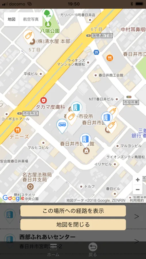 公共施設などを目的別に現在地から検索し、施設詳細情報や地図の表示、目的地までの経路検索も確認できます。