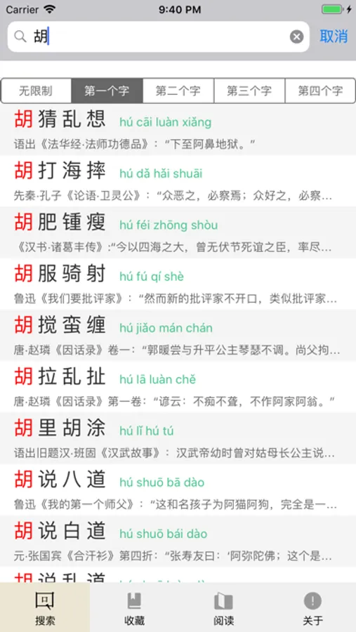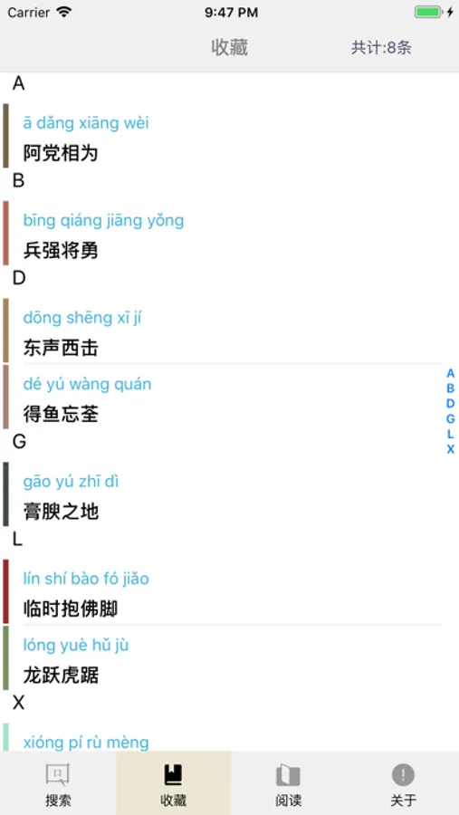 简单易用的成语词典。本词典支持按名称可以按汉字开头、结尾条件进行搜索。收藏功能方便你再次复习巩固。离线数据让你做到,随时随地,想查就查。