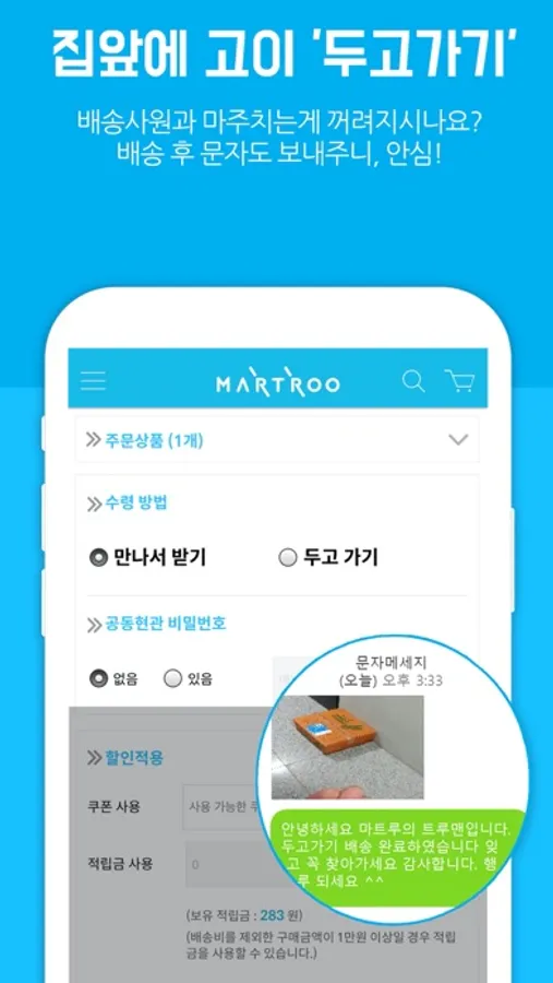 친절한 마트루의 배송사원이 집앞에 고이 두고 가드려요~ (문자 메시지는 덤)