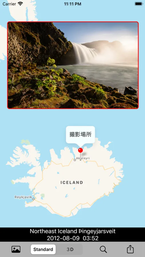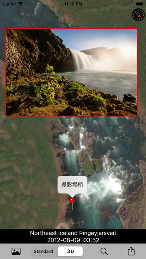 ・撮影場所(ドラッグ可能なピン配置)と撮影日時を表示します。