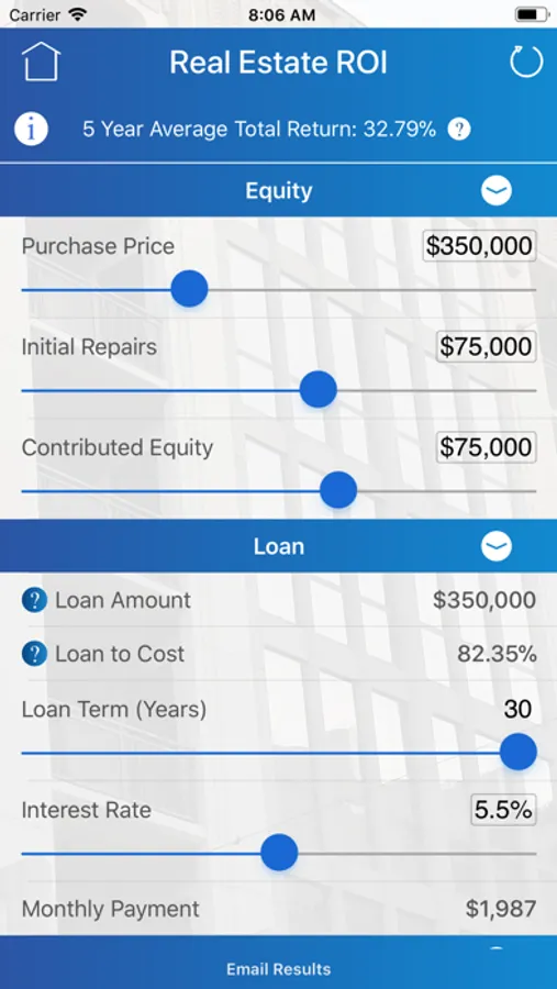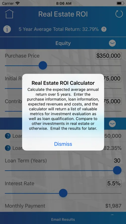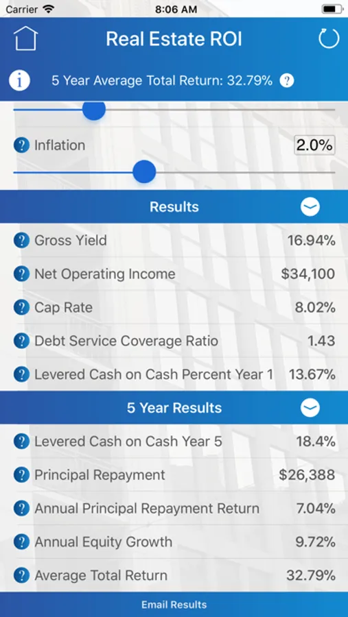 Calculate the expected average annual return over 5 years for your real estate investment. Enter the purchase information, loan information, expected revenues and costs, and the calculator will return a list of valuable metrics for investment evaluation as well as loan qualification. Compare to other investments in real estate or otherwise. Email the results for later.