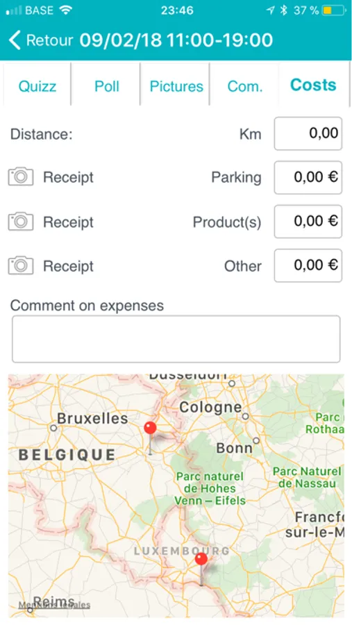 - Complétion du formulaire/rapport de la journée, ajout de photos et commentaires, gestion des frais