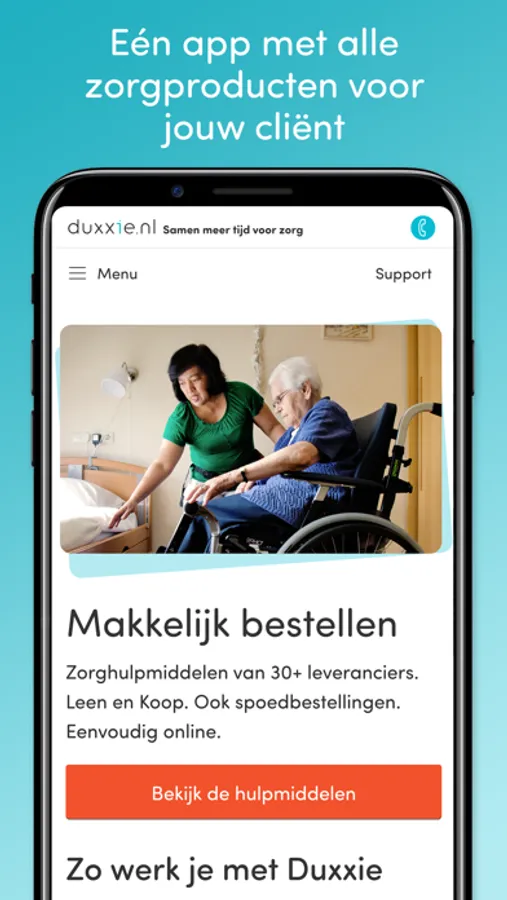Duxxie.nl biedt een prettige en veilige plek voor zorgprofessionals om zorgproducten en -diensten te bestellen voor hun cliënten. We ontwikkelen duxxie.nl samen met zorgprofessionals en leveranciers, zodat het echt werkt in de praktijk. We breiden de mogelijkheden en het assortiment steeds uit.