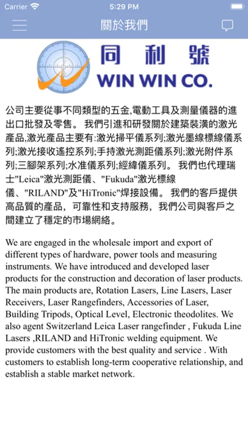 我們也代理瑞士”Leica”;激光測距儀”Fukuda”激光標線儀;"RILAND" 及"HiTronic" 焊接設備。 我們的客戶提供高品質的產品,可靠性和支持服務,我們公司與客戶之間建立了穩定的市場網絡。