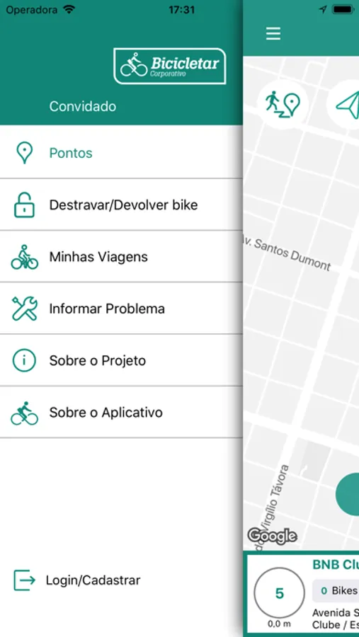 Com ele você pode se cadastrar, retirar bicicletas das estações, localizar estações, dentre outras ações.