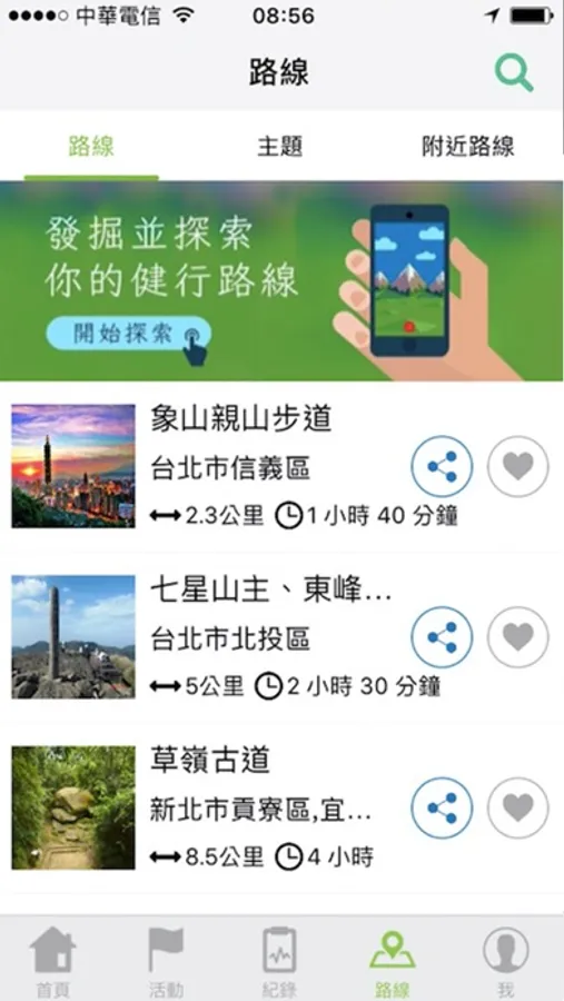 各式線上主題健行活動,使用專屬設計的主題相框與打卡點、及蒐集獨特線上健行徽章,分享自己的健行成就。