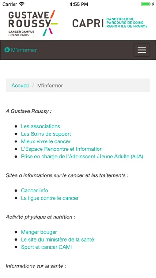- D’accéder directement à des sites internet sélectionnés donnant des informations sur la maladie, les traitements et les effets secondaires