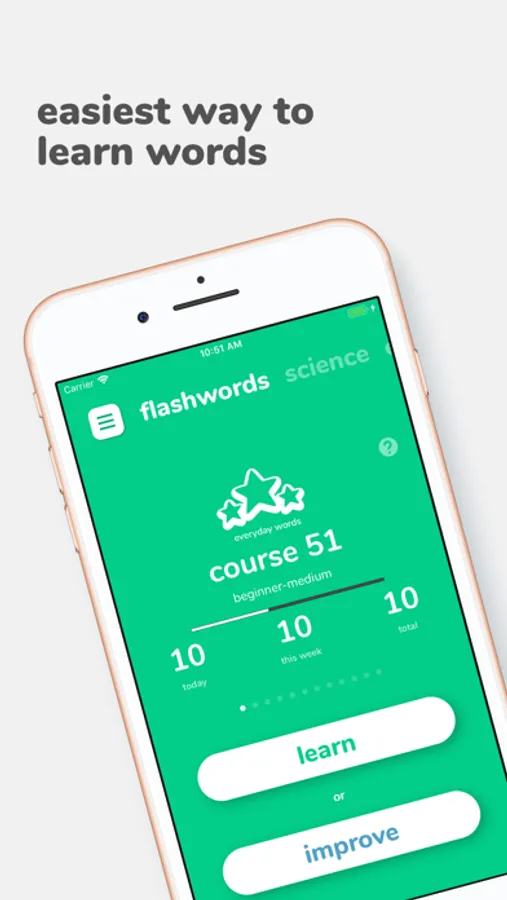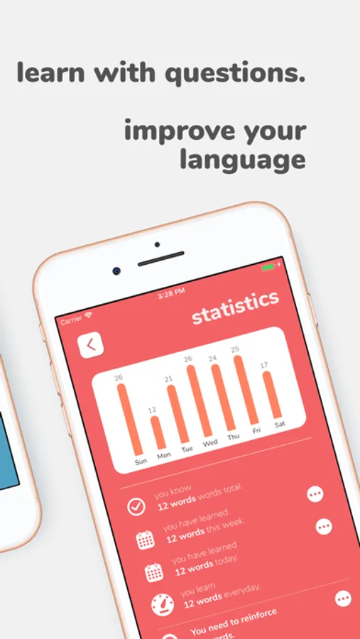 In learning phase, we will ask words according to your level. With our smart learning system, you will be able to see which words you need to improve and which words you struggle the most. You will also be able to see statistics on your learning journey.