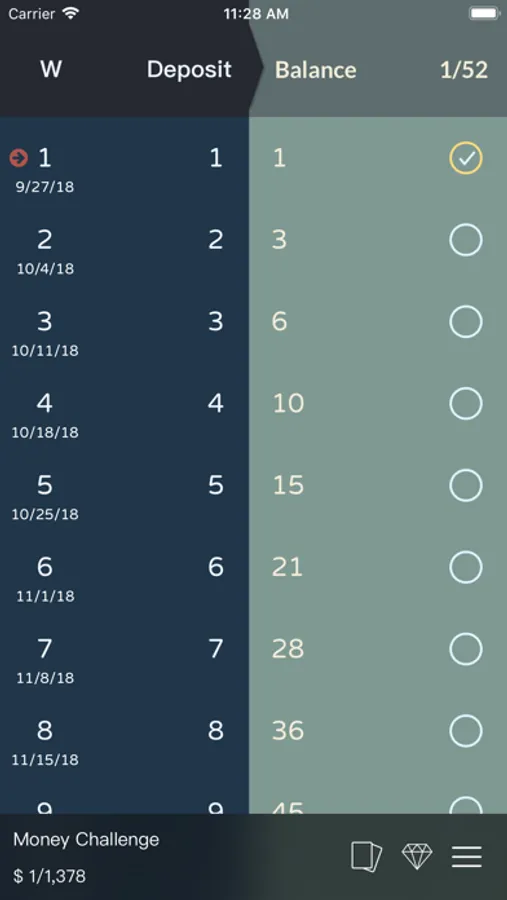 The 52-Week Money Challenge has been floating around the web since at least the beginning of this year. I designed this app with my friend to help us track our money, as well as to give us timely reminders. This app will make it easier for you to save up to your first pot of gold! Join us by starting a new challenge with your friends now!