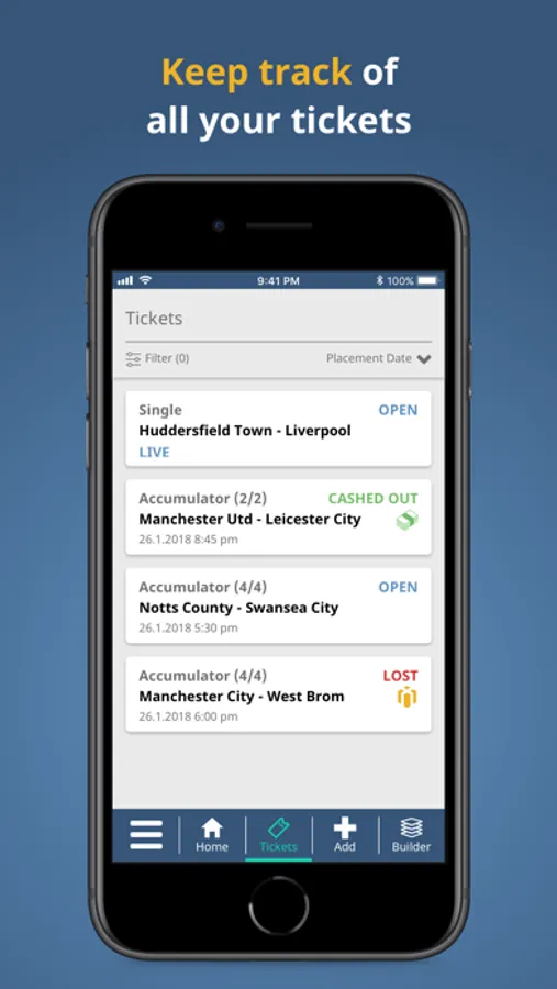 Check your tickets status anytime on-the-go, watch the live match flow to follow in-play events in real time or cash out early if your bet turns against you.