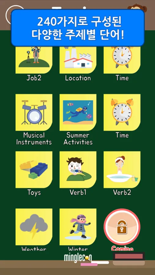 국제 영어 평가 기준인 CEFR을 근간으로 개발되었으며 각 앱별로 20개의 토픽, 240개 단어, 퀴즈, 문장으로 구성되어 있습니다.