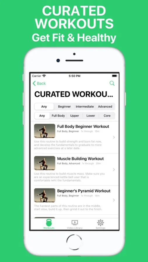 • Choose from a library of CURATED WORKOUTS designed for your kettlebell skill level (from beginner to advanced).
