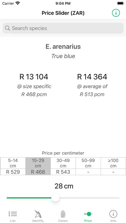 - Price info: view the value of the various species, based on plant size (2018 based).